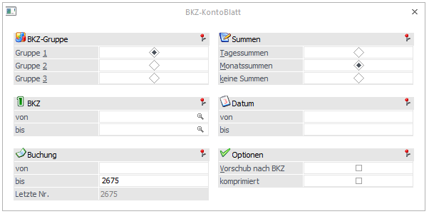 Wird die Checkbox aktiviert, erfolgt die Ausgabe in Kontoblattform, d.h. nach jeder BKZ wird ein Seitenvorschub durchgeführt.