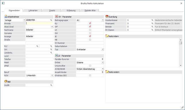 In den Stammdaten können die Basisinformationen eingegeben werden, die in weiterer Folge für die Kalkulation verwendet werden. Im ersten Schritt muss unterschieden werden, ob nun eine Vorlage, oder ein bereits bestehender Arbeitnehmer bearbeitet werden soll. Abhängig von dieser Einstellung kann im Feld