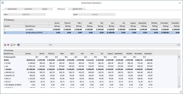 In der zweiten Tabelle werden, sofern der Button Rechnen aktiv ist, die Abrechnungswerte dargestellt. In der ersten Spalte steht die Bezeichnung, dann die Summe über alle Perioden und die einzelnen Perioden. Wie in der Einzelabrechnung ist es auch hier möglich auf Basis eines gewünschten Nettobetrages den Bruttobezug zu ermitteln. Dazu wird in der ersten Zeile die Erfassungszeile selektiert, dessen Bruttobezug geändert werden soll. In der Zeile "Netto" wird für die entsprechende Periode der gewünschte Nettobetrag eingetragen. Mit der Bestätigung des Betrages wird versucht einen entsprechenden Bruttobezug zu ermitteln. In den übrigen Zeilen werden, wie in der Arbeitnehmer Kosten Auswertung, vom Netto über Brutto bis zur Gesamtsumme die Arbeitgeberkosten angeführt. Bei den Werten für SVDG, KommSt, DB und DZ (die Bezeichnungen sind hinten mit einem + versehen) können durch einen Doppelklick auf die Bezeichnung die Werte zusätzlich in NZ und SZ aufgegliedert werden.