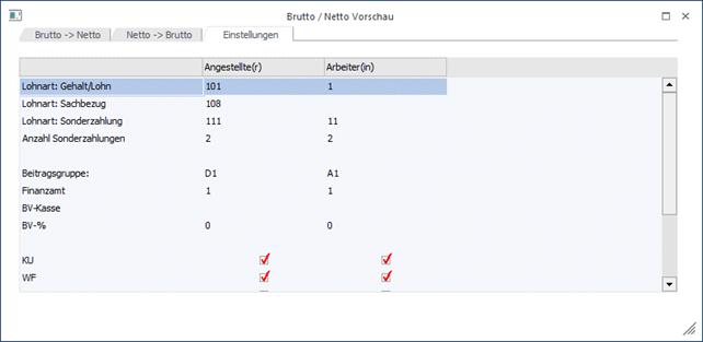Das Register Brutto -> Netto ermittelt aufgrund eines Bruttobezuges und der Einstellungen das Netto. Dabei können folgende Einstellungen vorgenommen werden: