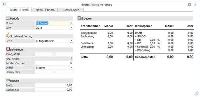 Das Register Netto -> Brutto ermittelt aufgrund eines gewünschten Nettobezuges und der Einstellungen das daraus benötigte Brutto. Dabei können folgende Einstellungen vorgenommen werden: