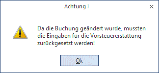 Wird nach dem Erfassen der Vorsteuererstattungs-Daten die Buchung in der Buchungstabelle noch geändert, werden die Eingaben zurückgesetzt und es wird auch eine entsprechende Meldung ausgegeben.