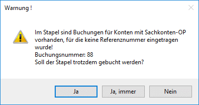 Vor dem Verbuchen eines Stapels wird geprüft, ob Konten mit Sachkonten-OP verwendet wurden, für die keine Referenznummer eingegeben wurde. In diesem Fall wird eine Warnung ausgegeben, in der bis zu max. 10 betroffene Buchungsnummern angezeigt werden. Der Stapel kann aber trotzdem verbucht werden.