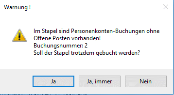 Beim Verbuchen eines Stapels wird geprüft, ob B-Buchungen für Personenkonten vorhanden sind. Ist dies der Fall, wird eine Warnung ausgegeben, bis zu 10 betroffene Buchungsnummern werden aufgelistet. Der Stapel kann aber trotzdem verbucht werden.