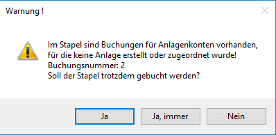 Vor dem Verbuchen eines Stapels wird geprüft, ob Buchungen auf Anlagenkonten ohne zugeordneter/erstellter Anlage existieren.