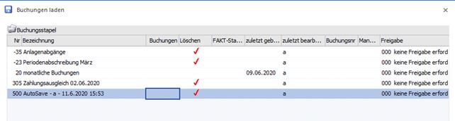 Je nach FIBU-Parameter Einstellung erfolgt das automatische Zwischenspeichern von Buchungsstapeln im Buchen Dialog-Stapel, Buchen Dialog-Stapel Quick und Buchen Zahlungsmittelkonten.