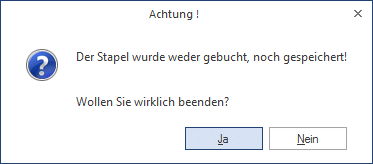 Damit wird das Fenster geschlossen. Wurden bereits mehrere Buchungszeilen erfasst, die noch nicht verbucht wurden, wird folgende Meldung ausgegeben: