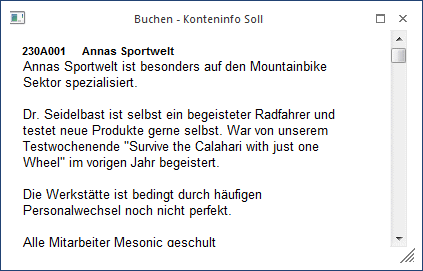 Wird dieser Button gedrückt (kann bereits durch die Einstellung aus den Fenstern "Buchen Eingangsrechnungen", "Buchen Ausgangsrechnungen", "Buchen Zahlungsmittelkonten" oder "Buchen Splitbuchungen" gedrückt sein), werden eigene Fenster für die Konteninfos geöffnet. Dabei gibt es jeweils ein Fenster für das Soll- und ein Fenster für das Haben-Konto. Hier können Sie z.B. die Kontennotiz oder die Adresse oder viele andere Felder des Kontenstammes anzeigen lassen. Bei Wünschen für Anpassungen dieses Formulars ist Ihnen Ihr mesonic-Betreuer gerne behilflich.