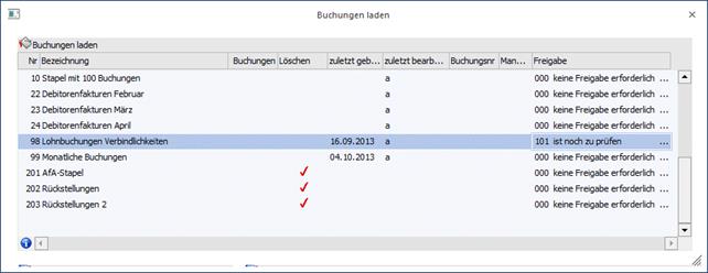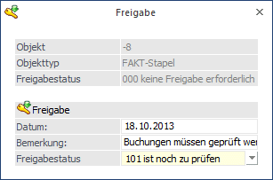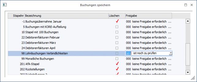 Wird in einem Buchungsfenster der Freigabestatus eines Stapels verändert, so wird dieser sofort in die Datenbank zurück geschrieben; ein Speichern des Stapels ist dazu nicht notwendig.