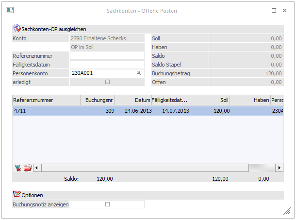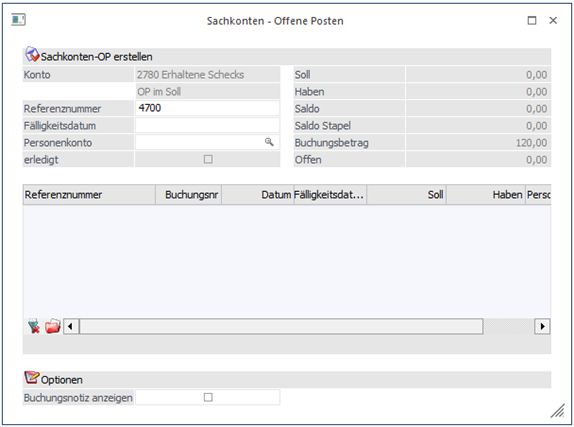 Durch Anwahl des Buttons "Sachk.-OP" kann eine OP-Verwaltung für Sachkonten durchgeführt werden. Voraussetzung dafür ist, dass das Sachkonto entsprechend angelegt wurde.