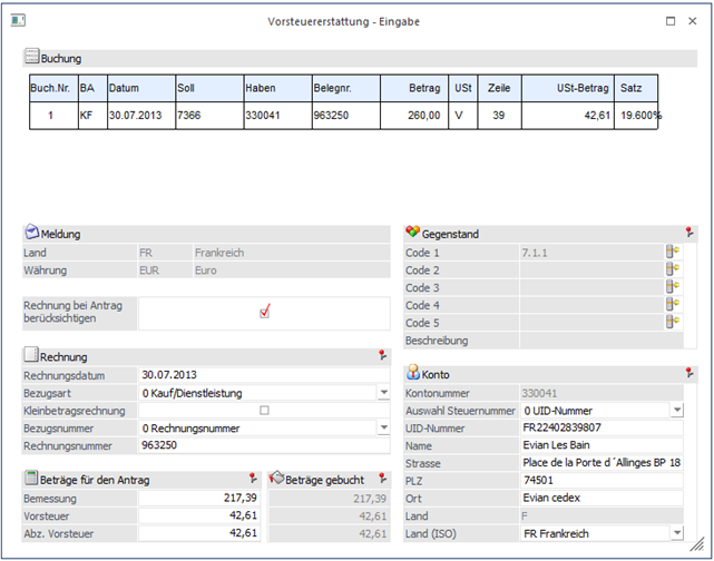 Im Fenster "Vorsteuererstattung - Eingabe" wird oben in einem Info-PDB die aktuelle Buchung angezeigt.