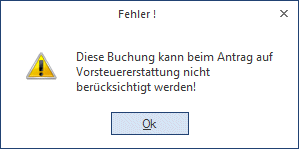Wird also der Button für eine Buchung geklickt, die nicht bei der Vorsteuererstattung mitspielt, da z.B.: keine Vorsteuer gebucht, keine Steuerzeile mit hinterlegtem Land verwendet wird usw., wird das Fenster nicht geöffnet und eine entsprechende Meldung wird ausgegeben.