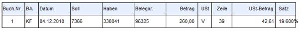 Danach folgt die Nummer der entsprechenden Zeile im Unternehmensstamm (z.B. 2), der Prozentsatz (z.B. 20 %) wird zur Information (nach dem USt-Betrag) ebenfalls angezeigt.