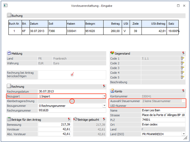 In diesem Fenster können schon beim Erfassen der Buchungen die für die Vorsteuererstattung notwendigen Daten eingegeben werden.