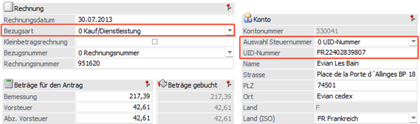 Wird die Bezugsart von "Kauf" auf "Import" geändert, wird das Feld "Steuernummer" initialisiert. (Siehe Bild oben). Wird nun wieder auf den "Kauf" zurückgesetzt, so wird die UID-Nummer aus dem Kontenstamm wieder eingetragen bzw. geladen.