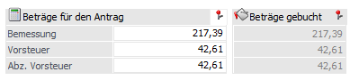 Unten im Fensterbereich werden neben den editierbaren Beträgen, entweder die aus der Buchung gerechneten Beträge angezeigt, oder aber die Beträge in der verwendeten Fremdwährung, wenn diese nicht der Währung des Landes entspricht. In diesem Fall werden die Beträge wie auch im Menüpunkt "Vorsteuererstattung" auf 0 gesetzt für den Antrag.
