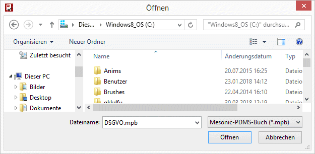 Drückt man den "Buch importieren" Button, so öffnet sich das "Öffnen" Fenster und eine Datei mit .mpb Endung kann für den Import ausgewählt werden.