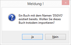 Sollte ein Buch mit demselben Namen bereits vorhanden sein, so erfolgt eine Meldung, ob man das Buch trotzdem importieren möchte: