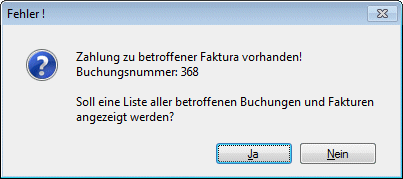 Ist dabei eine Rechnung ausgewählt worden, zu der es bereits Zahlungen gibt, so erscheint eine Hinweismeldung mit der ersten entsprechenden Buchungsnummer: