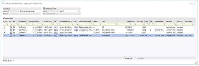 In dieser erweiterten Tabellenausgabe ist für die Spalten "Konto" und "Gegenkonto" die Drilldown-Funktion vorhanden, sowie bei der Kontoblattauswertung für ein Steuerkonto die "Bmg-Konto".
