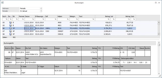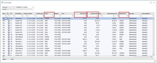 Die Basis der Journalzeilen in der Tabelle bildet immer die zuvor getroffene Selektion im FIBU-Journal bzw. im Kontoblatt. D.h. in der Tabelle kann dieses Datenmaterial nur weiter eingeschränkt werden.