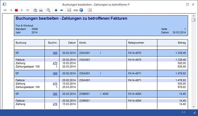 Bei Bestätigen mit Ja wird eine Liste mit allen entsprechenden Fakturen und den zugehörigen Zahlungen am Bildschirm ausgegeben. In dieser Liste werden die betroffenen Buchungen mit den Fakturen (d.h. jene, zu denen Zahlungen vorhanden sind) und die entsprechenden Zahlungen bzw. Buchungen in Zahlungsstapeln (aus dem Zahlungsverkehr) angezeigt. Mittels Klick auf die jeweilige Buchungsnummer kann die Buchungsinfo geöffnet werden.
