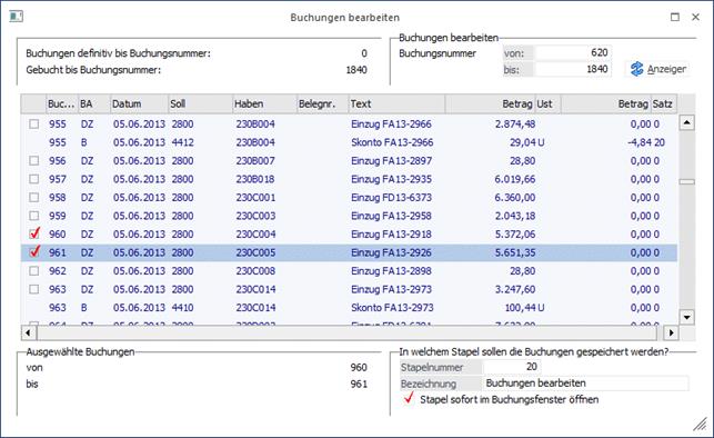 In diesem Beispiel werden die noch vorläufigen Buchungszeilen 620 bis 1840 angezeigt, und von dieser Auswahl sollen die Buchungszeilen 960 und 961 in einen Stapel (Nr. 20) zur Bearbeitung geladen werden.