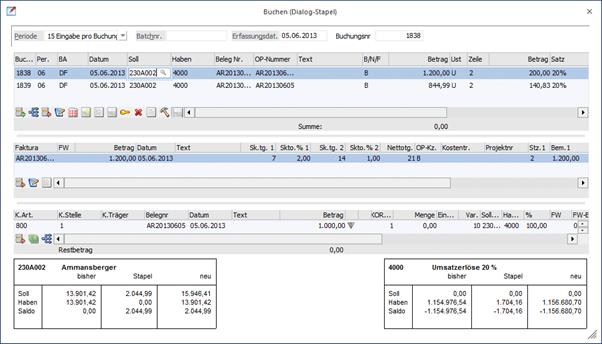 In der Buchungszeile 1838 wurde versehentlich beim Erfassen des ursprünglichen Stapels die falsche Debitorennummer kontiert (230A002 anstelle von 230A001) sowie anstelle von richtigerweise nur 1.000,- ein Betrag von 1.200,- eingegeben.