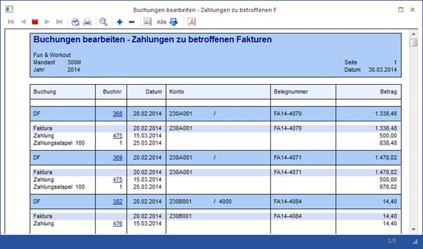 Bei Bestätigen mit Ja wird eine Liste mit allen entsprechenden Fakturen und den zugehörigen Zahlungen am Bildschirm ausgegeben. In dieser Liste werden die betroffenen Buchungen mit den Fakturen (d.h. jene, zu denen Zahlungen vorhanden sind) und die entsprechenden Zahlungen bzw. Buchungen in Zahlungsstapeln (aus dem Zahlungsverkehr) angezeigt. Mittels Klick auf die jeweilige Buchungsnummer kann die Buchungsinfo geöffnet werden.
