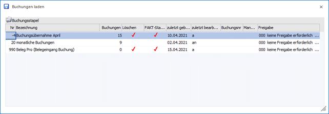 Wird im Buchen (Dialog Stapel) oder im Buchen (Dialog Stapel) Quick der LADEN-Button angeklickt, werden alle Buchungsstapel angezeigt, die im Fenster "Buchen (Dialog Stapel)" oder "Buchen (Dialog Stapel) Quick bearbeitet werden können. Dazu gehören die Stapel aus der Fakturierung bzw. aus der Anlagenbuchhaltung und die Stapel, die im "Buchen (Dialog Stapel)", "Buchen (Dialog Stapel) Quick" oder im "Buchen Zahlungsmittelkonten" erfasst wurden.