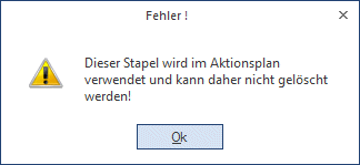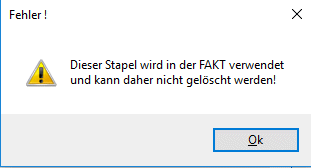 Vor dem Löschen eines abweichenden FAKT-Stapels wird geprüft, ob dieser in der FAKT bereits verwendet wird, z. B als Buchungsstapel in einer Belegart hinterlegt, und gelöscht werden kann.