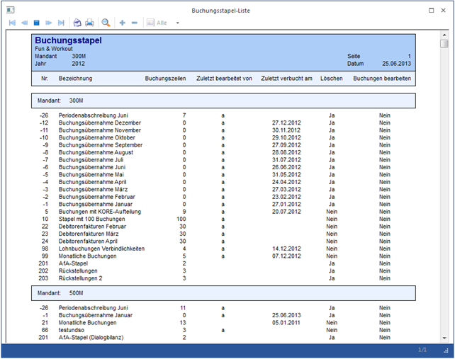 Über den Button Liste Bildschirm/Drucker wird eine Buchungsstapel-Liste ausgegeben, auf der die Buchungsstapel aller zuvor ausgewählten Mandanten (Hauptmandant und Submandanten) aufgelistet werden.
