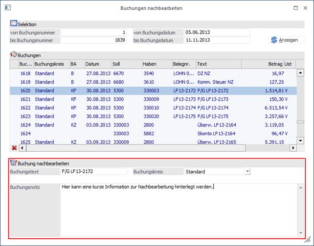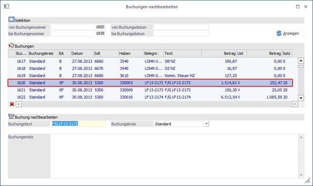 Der Buchungstext und die Buchungsnotiz können für jede Zeile einzeln editiert werden, der Buchungskreis gilt für alle Zeilen einer Buchung und kann daher nur für die erste Zeile geändert werden. Beim Speichern wird der Buchungskreis, aber in allen Zeilen übernommen.