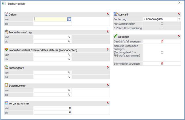 Zur Nutzung dieser Optionen ist es notwendig nach bestimmten Produktionsaufträgen in der Buchungsliste zu selektieren.