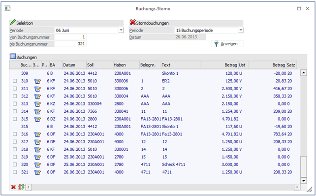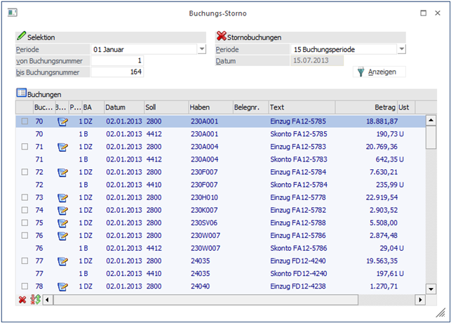 Durch Aktivieren der Checkbox vor der jeweiligen Zeile wird festgelegt welche Buchungssätze storniert werden.