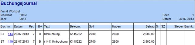 Beide Buchungszeilen werden mit einem "ST" vor der Buchungsnummer gekennzeichnet. Dies ist z.B. im Journal, Kontoblatt oder auch Kassenbuch ersichtlich.