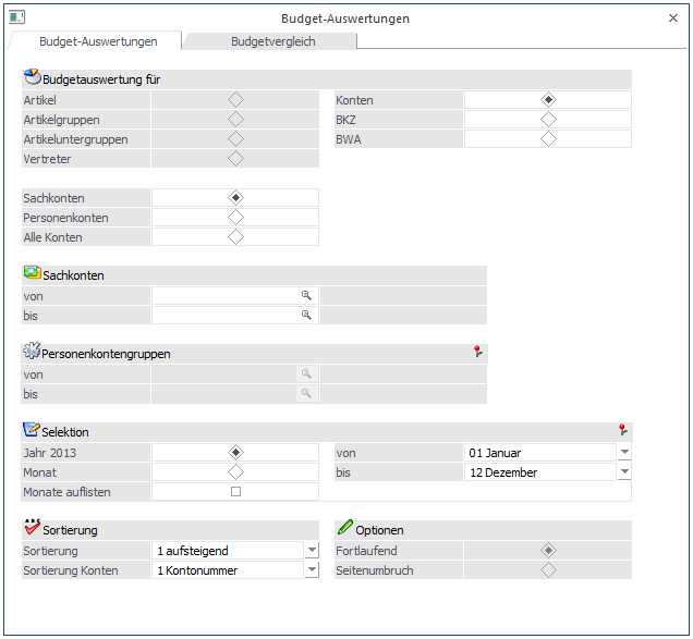 Werden keine Einschränkungen getroffen, wird eine Budgetliste über alle Artikel ausgegeben.