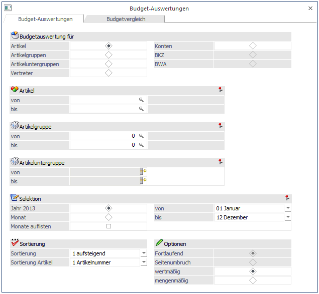 Wenn Sie eine Artikel-Budgetliste ausgeben wollen, haben Sie folgende Einschränkungskriterien zur Auswahl: