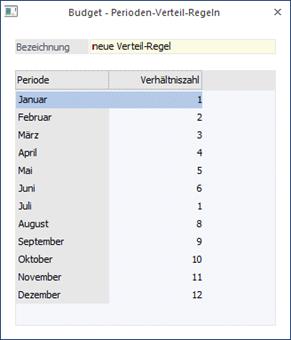 Im Fenster "Budget - Perioden-Verteil-Regeln" kann den einzelnen Monaten eine Verhältniszahl zugewiesen werden. Es handelt sich hier nicht um Prozentwerte; der eingegebene Budgetwert wird durch die Summe der Verhältniszahlen dividiert - das Ergebnis wird dann pro Monat mit der Verhältniszahl multipliziert und in die Budgettabelle eingetragen.