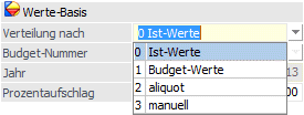 Es wird ausgewählt, welche Art von Werten als Basis für die Verhältnis-Berechnung verwendet werden sollen. Bei Ist- und Budget-Werten kann zusätzlich noch ein Wirtschaftsjahr selektiert werden. Entscheidet man sich für "aliquot" oder "manuell" ist eine "Verhältnis-Nummer" auszuwählen.
