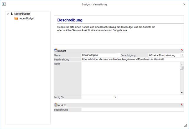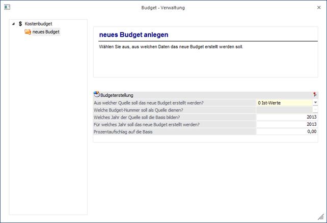 Durch Anwählen dieses Eintrages in der Baumstruktur kann ein neues Budget erstellt werden.