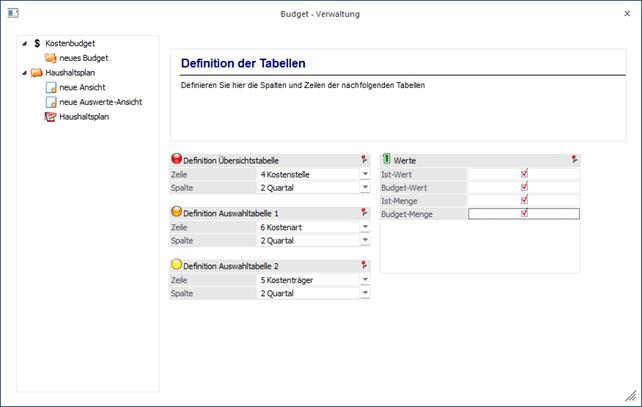 Zu einem Budget können Auswerte-Ansichten erstellt werden. Die Strukturierung der Auswertung kann frei gewählt werden.