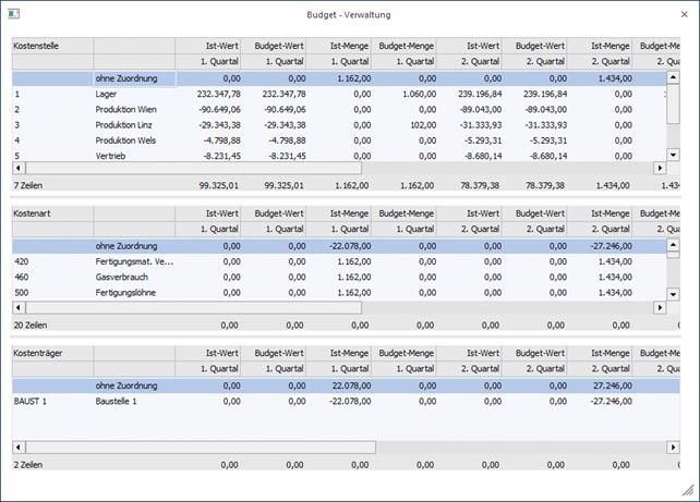 In diesen Tabellen werden nun die errechneten, bzw. bereits erfassten Budget- und Istwerte angezeigt. Die 3 Tabellen (bzw. 2 Tabellen im FIBU-Budget) sind zusammenhängend - das heißt, wenn z.B. wie im Beispiel unten eine Ansicht nach Kostenstelle/Kostenart/Kostenträger definiert wurde und in die Kostenstelle 2 markiert wird, werden in der Kostenartentabelle die Werte angezeigt, die für die jeweilige Kostenart mit der selektierten Kostenstelle erfasst wurden.