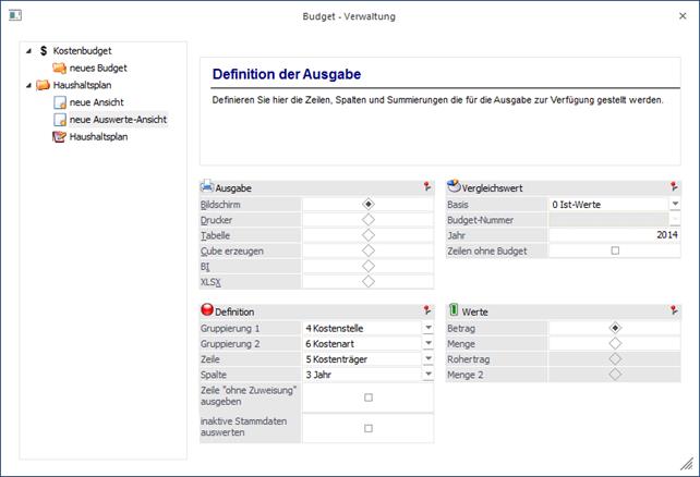 Zu einem Budget können verschiedene Auswerte-Ansichten erstellt werden. Diese dienen der Auswertung der Budget-Ansichten. Die Strukturierung der Auswertung kann frei gewählt werden. Die Selektion kann nach denselben Datenbereichen erfolgen, wie bei einer "normalen" Ansicht. Das heißt, die ersten beiden Schritte gleichen denen einer Neuanlage einer Ansicht. Im Schritt "Definition der Ausgabe" wird festgelegt, wie die Auswertung strukturiert werden soll.