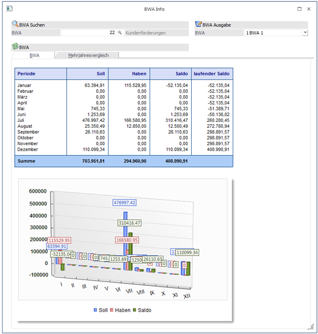In diesem Fenster werden die Umsätze einer BWA sowohl in Zahlen als auch in einer Grafik dargestellt. Dabei werden die gebuchten Daten in den Perioden angedruckt, die lt. Buchungsdatum gültig sind. D.h. verläuft die Periode Januar vom 01. Januar bis 05. Februar, wird ein am 03. Februar gebuchter Wert in der Periode Januar angezeigt.