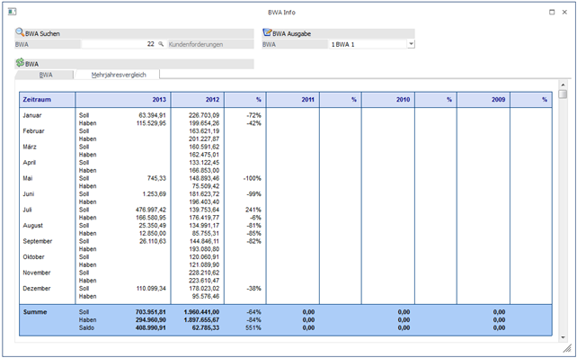 Durch Anwahl des Registers "Mehrjahresvergleich" können neben den laufenden Umsatzzahlen auch die Umsatzzahlen der letzten (max. 5) Jahre angezeigt werden.
