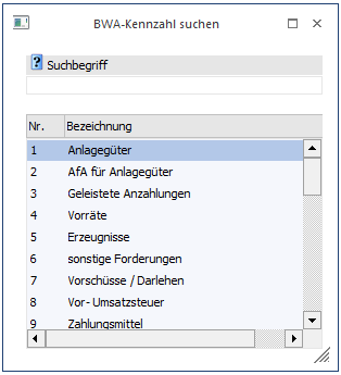 Durch Drücken der F9-Taste oder Anklicken des Lupen-Symbols auf einem BWA-Feld wird der BWA-Matchcode gestartet. Der Suchbegriff kann direkt im Feld "BWA-Nr." eingegeben werden, wobei als Suchbegriff die BWA-Bezeichnung (oder ein Teil davon) herangezogen wird.