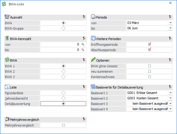 Es kann entschieden werden, für welche BWA die Auswertung erfolgen soll.