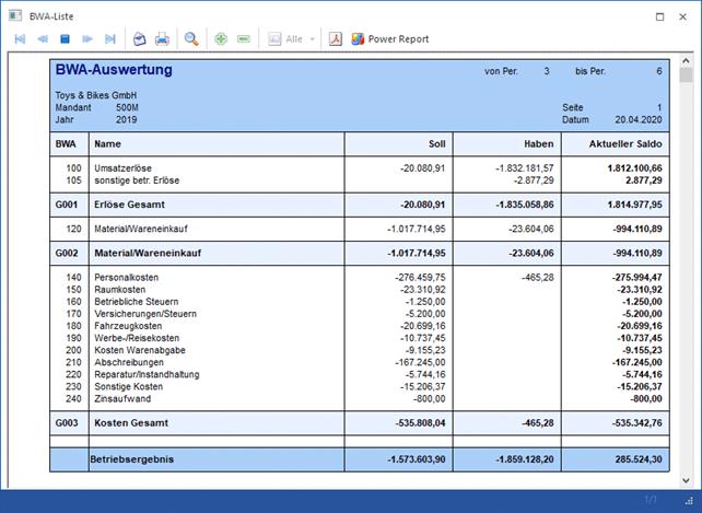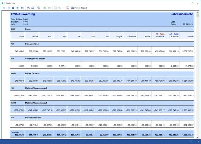 Bei der Anwahl des Buttons "Ausgabe Tabelle" wird die BWA-Liste in Form einer WinLine Tabelle dargestellt.