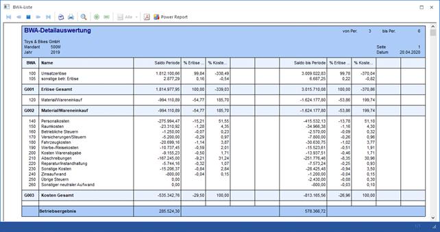 Ist diese Option aktiviert, dann werden neben den BWA-Kennzahlen auch die dazugehörigen Konten mit ihren Werten mit angedruckt.